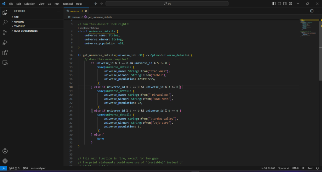 - If the universe id is divisible by 3 – then that universe is the star wars universe, where the rebels won and the population is the max number that a u32 can fit!