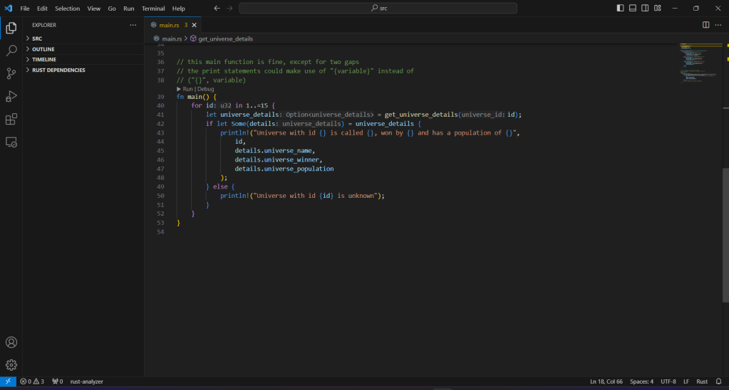 Your task is to modify the given structure, get_universe_details function and the noted areas of the main function, inside multiverse/src/main.rs, such that it loops through id’s of 1-15, and prints out the universe details of the universe with that ID.